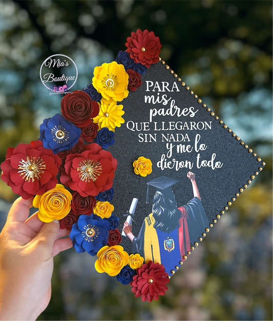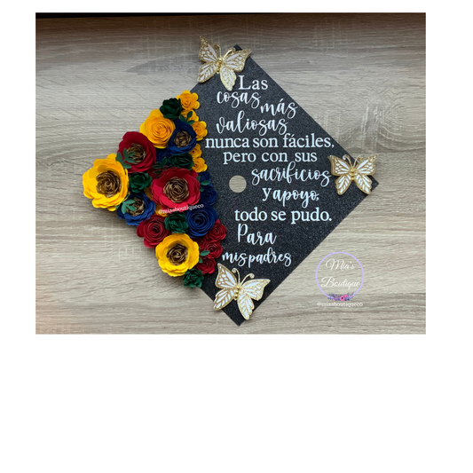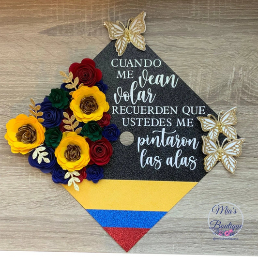 Custom Personalized Colombia Graduation Cap Topper Floral sunflowers roses and gold butterflies Colombian Heritage
