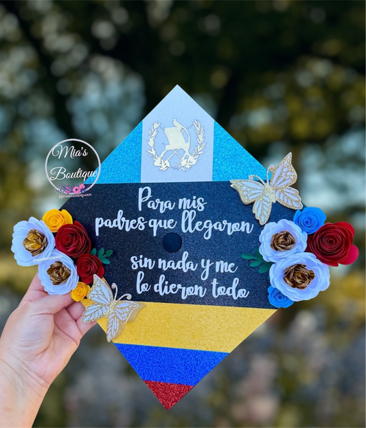 Custom Personalized Colombia Graduation Cap Topper Floral sunflowers roses and gold butterflies Colombian Heritage and Guatemala Graduation Cap