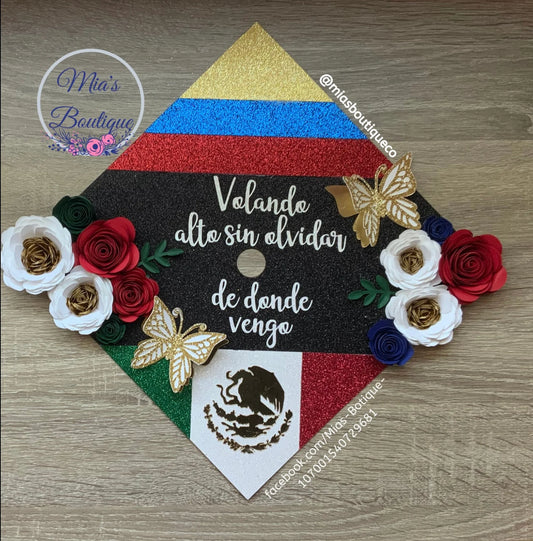 Custom Colombia Colombian Graduation Cap Topper Colombia Flag and Mexican Country Sunflower Roses Gold Butterflies