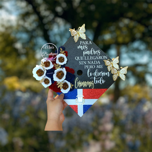 Custom Personalized Dominican Republic Graduation Cap Topper, Dominican Republic & Mexico Graduation Cap with flowers