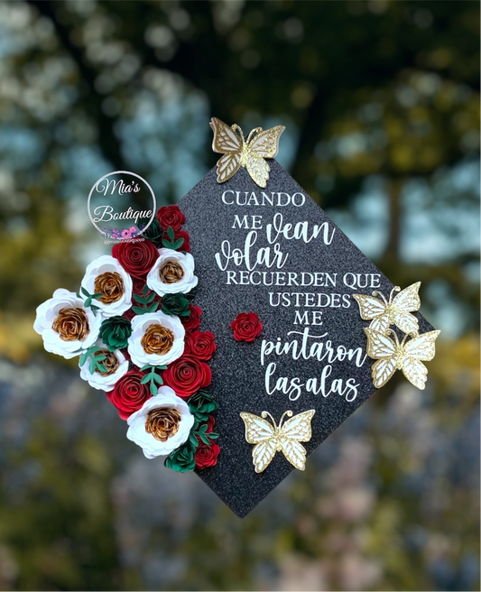 Custom Personalized Mexico Graduation Cap Topper Floral Sunflowers Roses Gold accents Butterflies Virgen de Guadalupe and Para Mis Padres Message