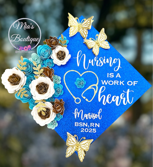 Custom Personalized Nurse Graduation Cap Topper Blue Heart Stethoscope with Nursing Is A Work Of Heart Message and Floral Sunflowers Blue White Gold Flowers Gold Butterfly