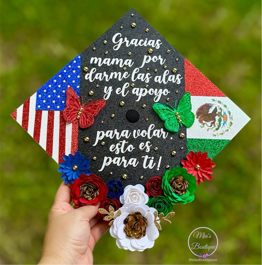 Custom Mexico Graduation Cap Topper Flowers roses sunflowers butterfly with Gracias a Dios message