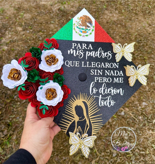 Custom Mexican Graduation Cap Topper Virgin Mary Lady of Guadalupe Para Mis Padres Mexico Flag Mexican Hispanic Flower Gold Butterflies Mexico Grad Cap