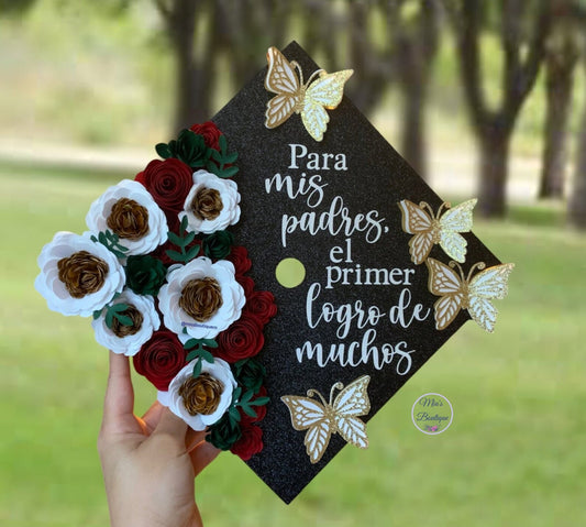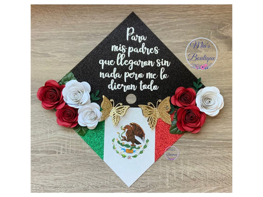 Custom Mexico Graduation Cap Para Mis Padres Flag Flower Roses Sunflowers Butterfly Mexican American Heritage